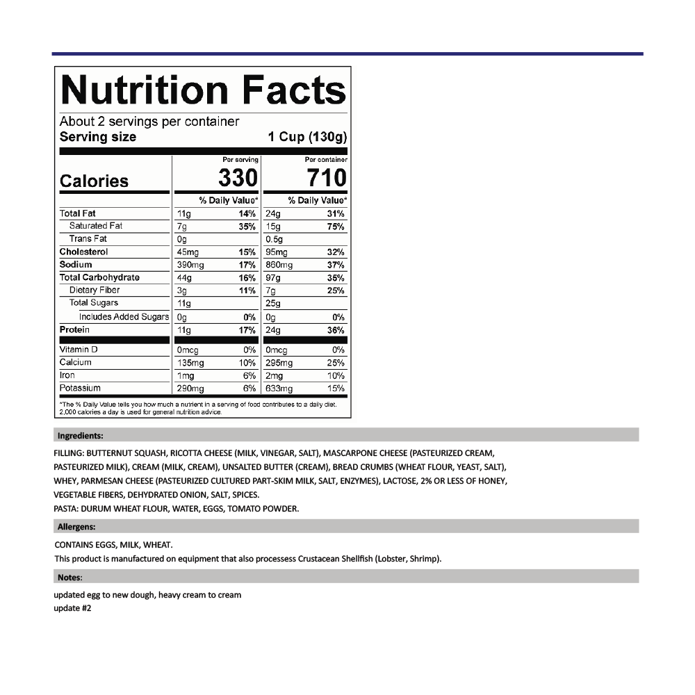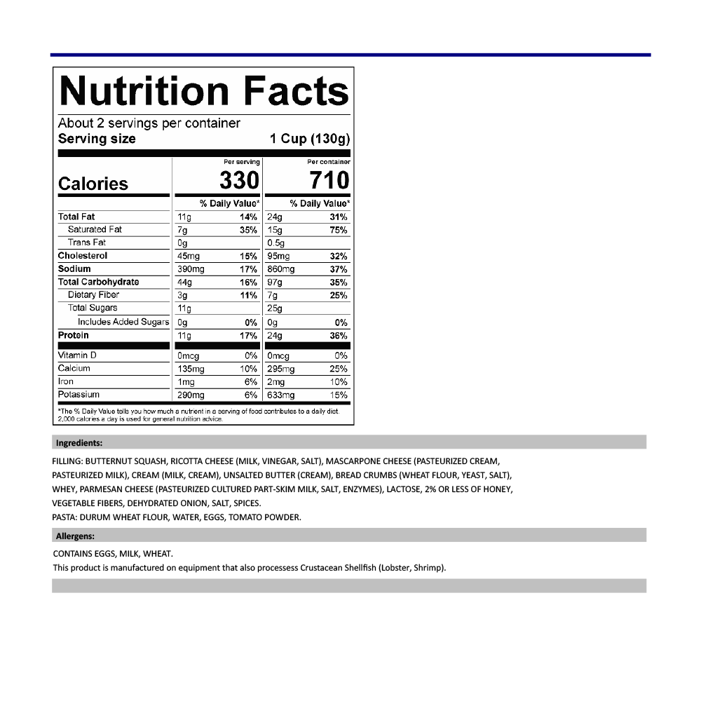 Our Butternut Squash Ravioli brings the warmth of fall into every bite! The silky, naturally sweet butternut squash is carefully wrapped in thin dough. This comforting dish offers a velvety texture that melts in your mouth, with a savory richness that is simply irresistible.