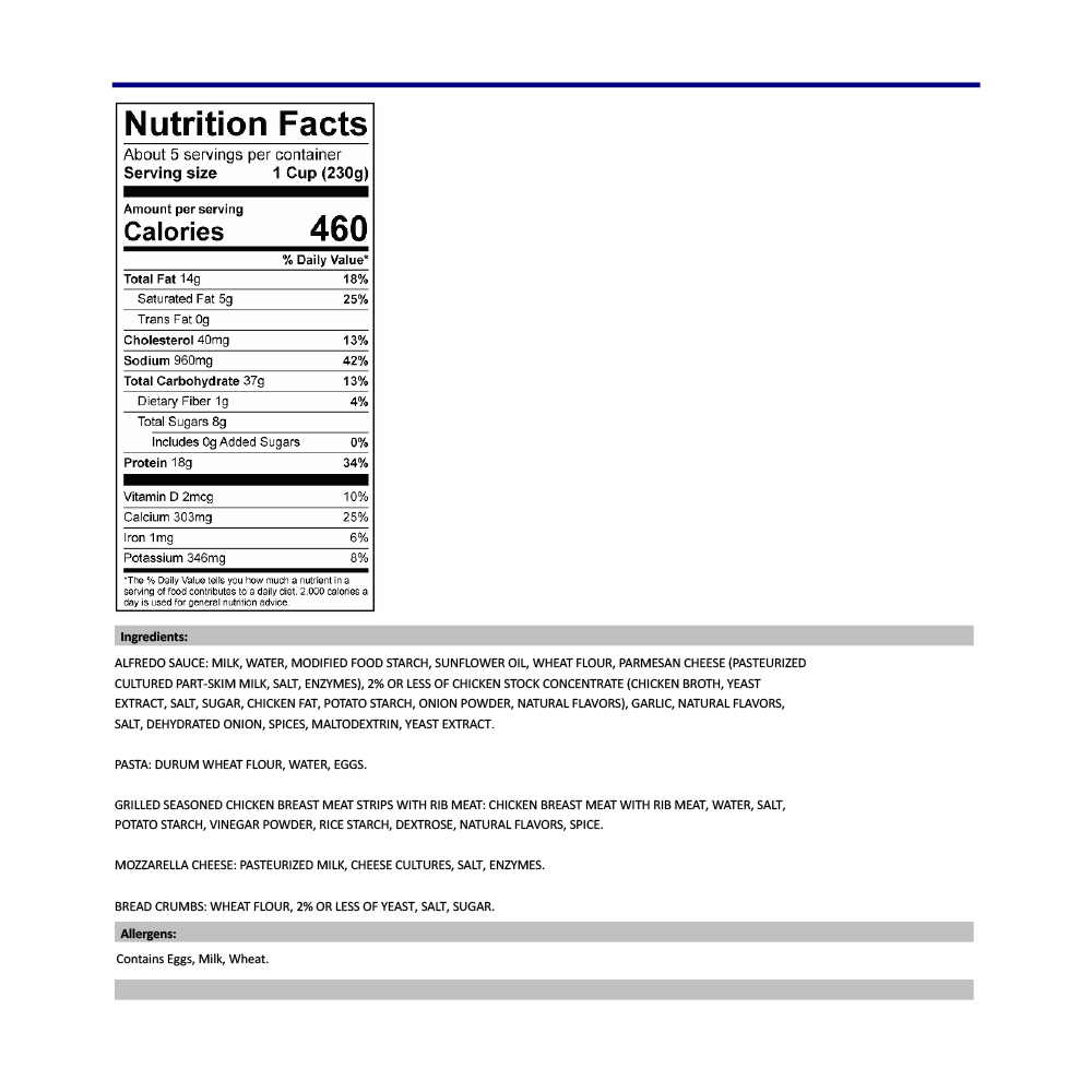My family recipe, made with grilled white chicken, creamy alfredo sauce, mozzarella cheese, crispy bread crumbs & signature dough.