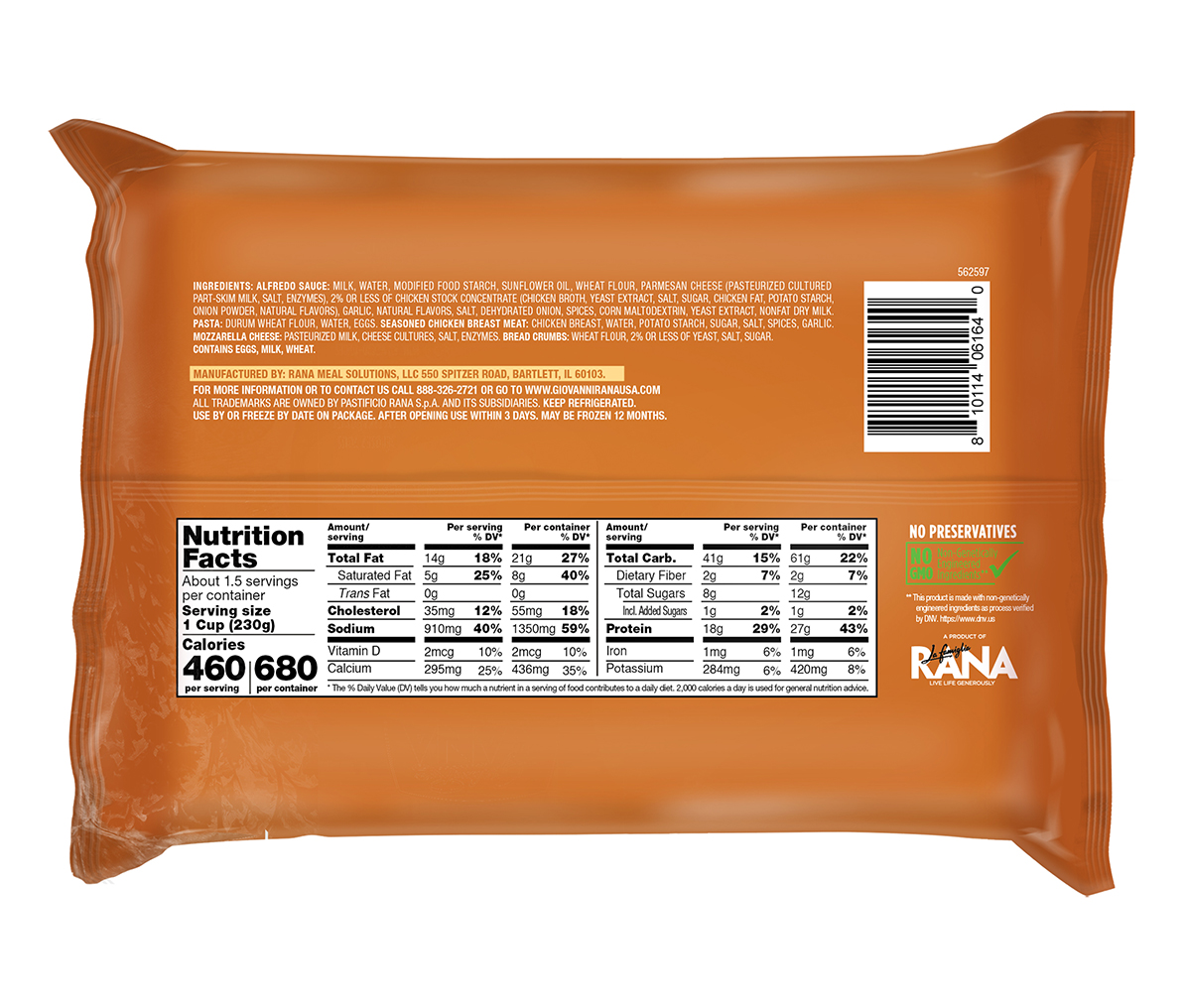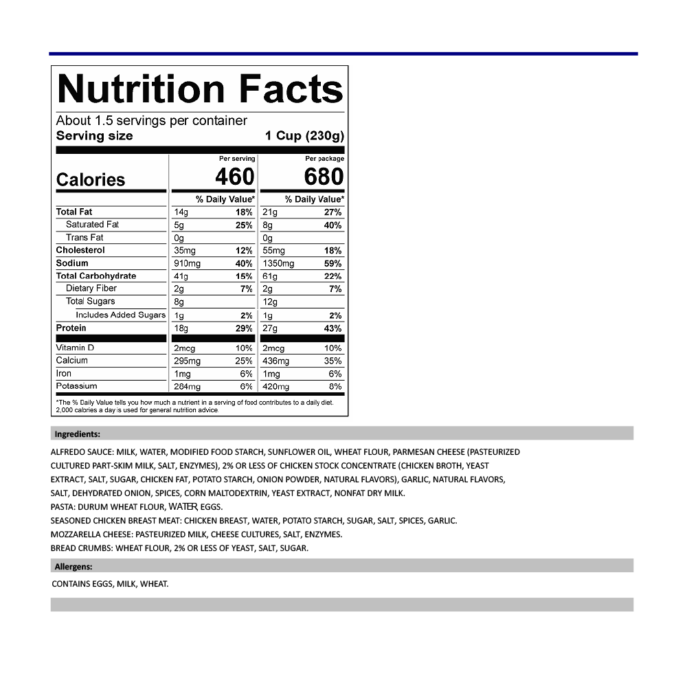 5 min Cooking Time, 2 Servings, 460 Calories per serving Follow cooking directions. Make sure product reaches temperature of 160F. MICROWAVE INSTRUCTIONS (1200 W): 1. Remove carton and plastic film. Place the microwave safe tray in the microwave.