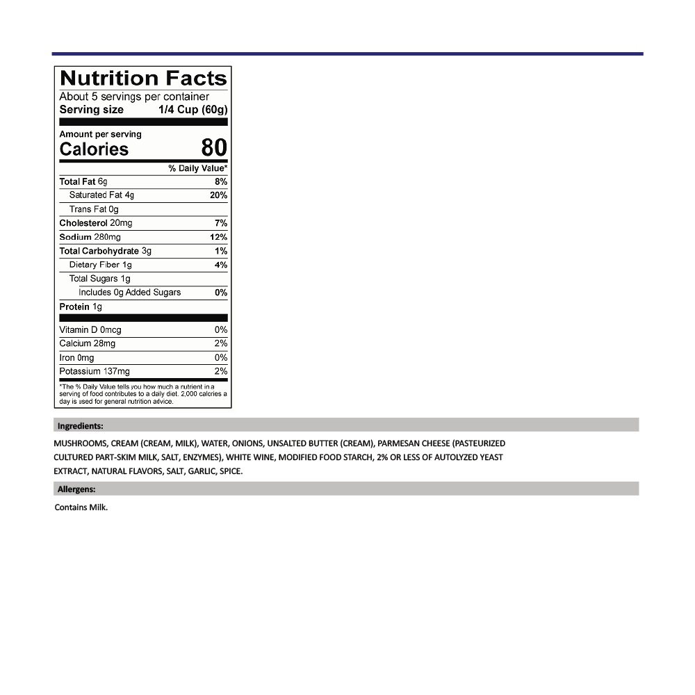 Our creamy sauce is cooked in our kitchen, from a traditional recipe of Mr. Giovanni Rana. Our mushrooms are sauteed with onion, garlic, and white wine.