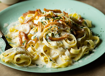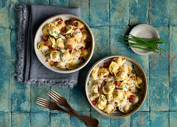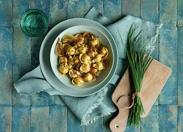 CHEESE LOVERS TORTELLONI, CARAMELIZED ONIONS AND CHIVES