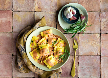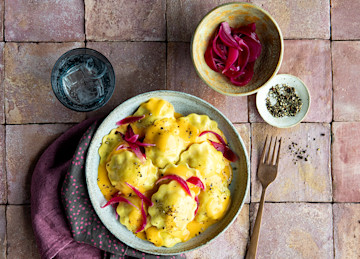 BUTTERNUT SQUASH RAVIOLI WITH BUTTERNUT SQUASH, CRANBERRIES AND BROWN BUTTER SAGE SAUCE