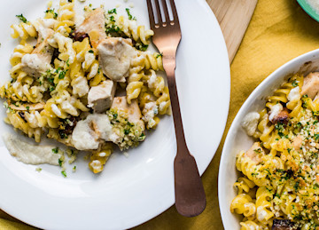 Chicken and Pancetta Fusilli Alfredo with Cheesy Garlic Breadcrumbs