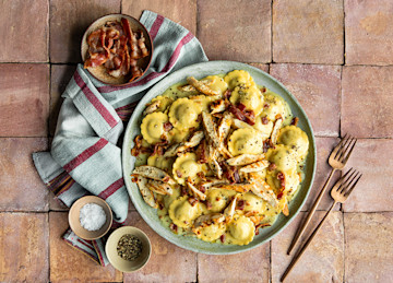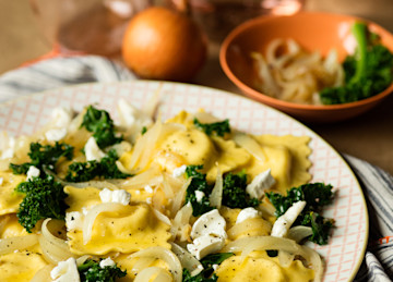 Chicken & Roasted Garlic Ravioli with Kale, Caramelized Onions & Goat Cheese